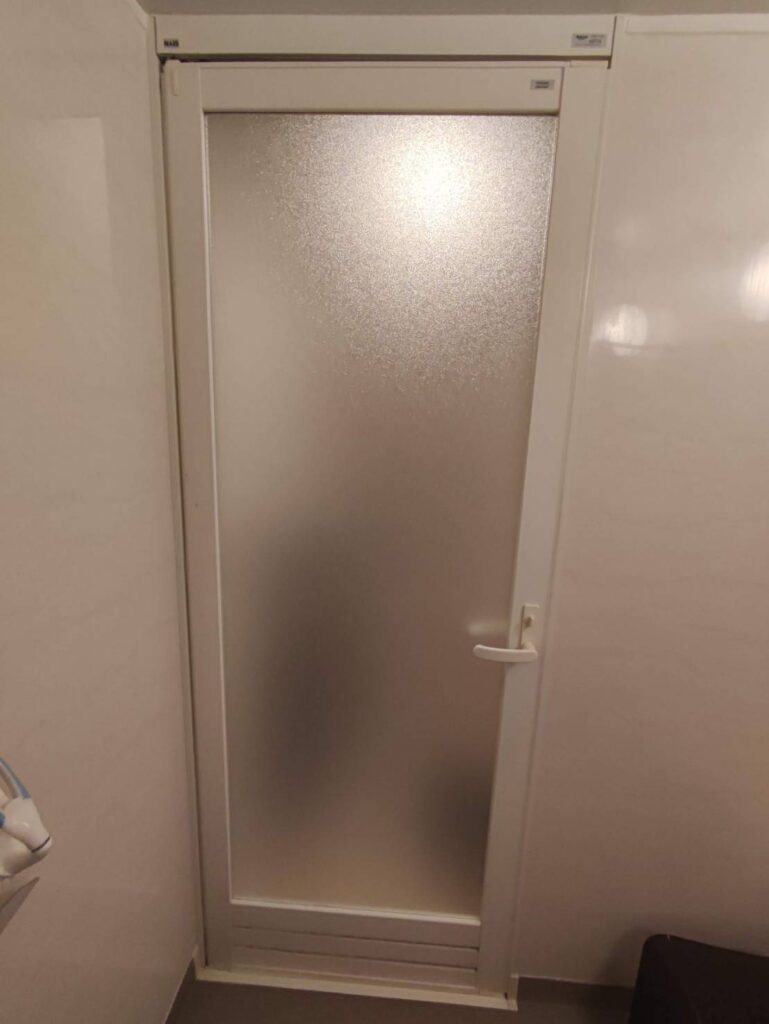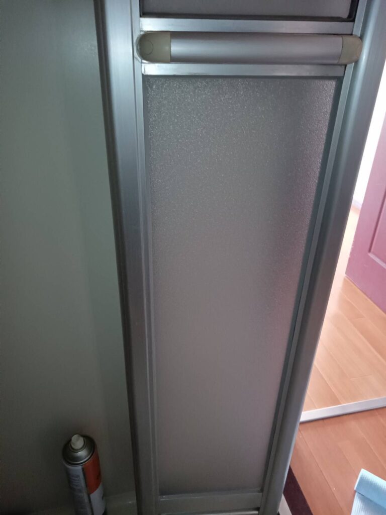 アルミサッシ浴室ドアのアクリル交換事例です。浴室ドアのアクリル板厚みは3mmまたは3.5mmが使用されていることが多く、構造によって交換修理できます。