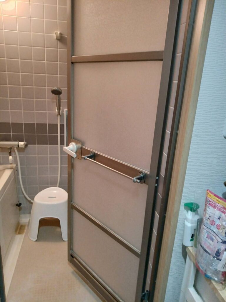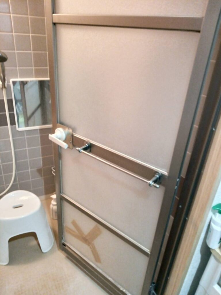 浴室ドアは丁番ビスが固着していることも多く、状況によっては下処理を行いながら作業します。作業時間の目安は1〜2時間程度です。