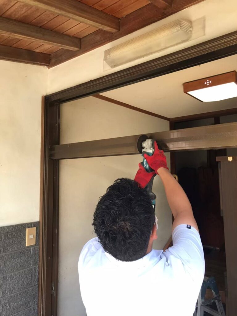 玄関ドア・玄関引戸の交換では、既存の枠の上から新しい枠を被せるカバー工法が一般的です。しかし今回はサッシ枠の歪みが大きく、引戸が正常に開閉できない状態だったため、既設枠を撤去して新しい枠を取り付ける斫り(はつり)工法で施工しました。